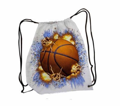 Personalized custom Draw String Backpack, White, 15.5″ x 19.25″, 100% Polyester. Great for sports, the grommetted nylon strings are quite sturdy and this bag looks great imprinted.